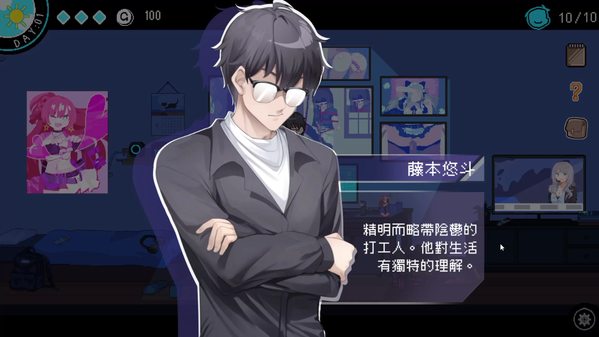 最上排從左到右分別是「現在時間」、「行動點」、「金錢」、「心情值」,在心情值下方的則是任務列表、教學和道具跟一些遊戲的機能,並沒有太多繁瑣的設定。