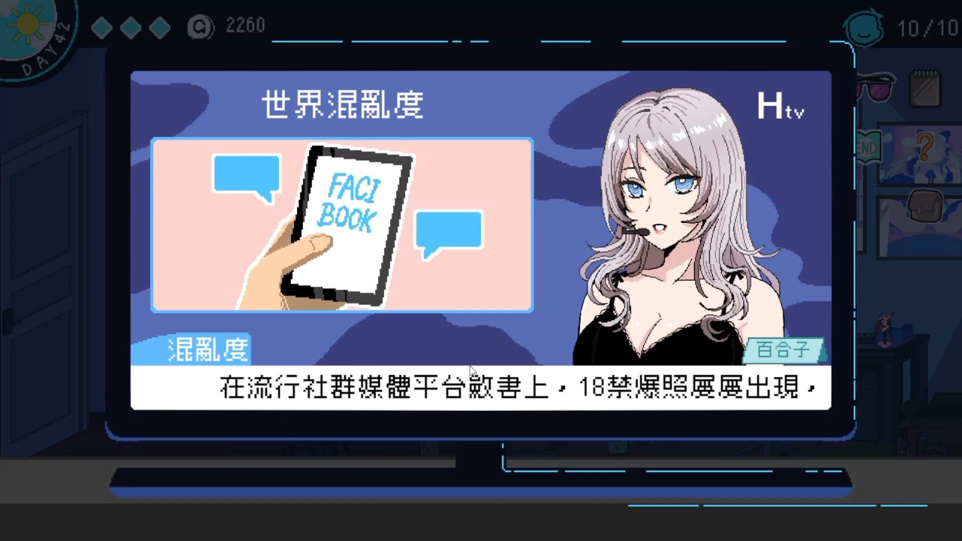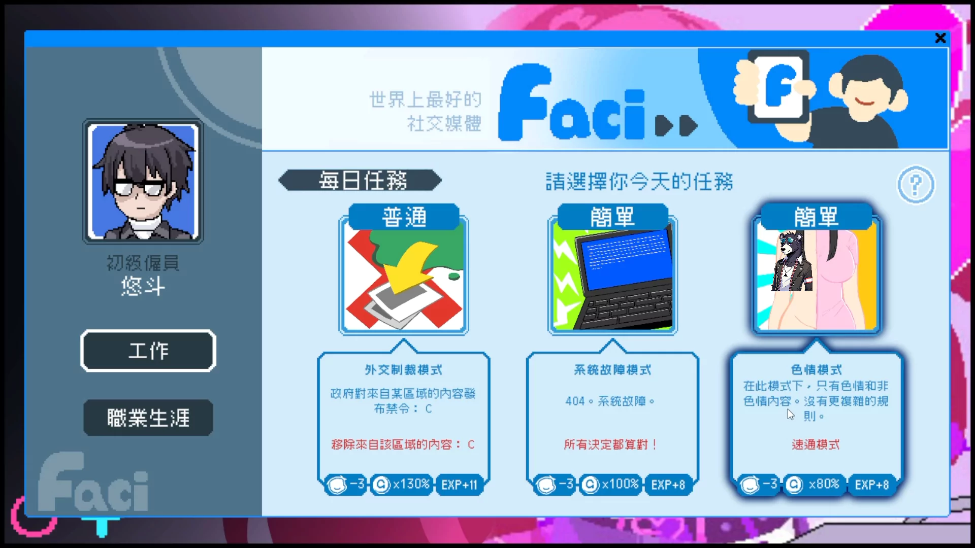 先講提升的方式,最快的方法就是在審查工作的時候將「包含情色內容的圖片」同意發佈出去,每放一張就會+3,然後在選擇工作的時候可以挑選一種「不論做什麼決定都算正確的」簡單模式(隨機出現),然後把所有色情圖片都發佈出去,最極端的情況下可以一口氣上升30混亂度。