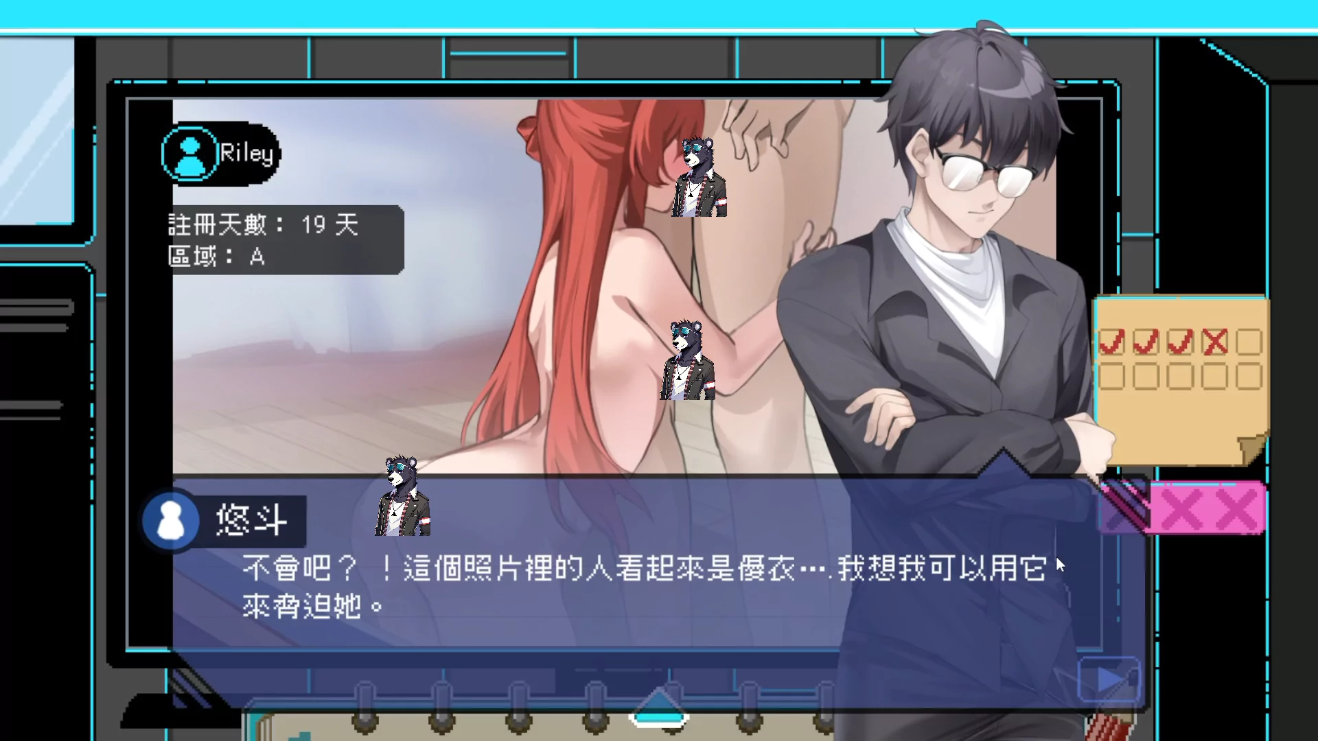 再來是本作最核心也最切題的系統─「社群審查」工作,簡而言之就是檢查大眾上傳到社群網站的媒體是否符合規範的工作,在遊戲中除了是主角收入的主要來源以外,也是能夠收集攻略女主角「秘密」的關鍵手段。