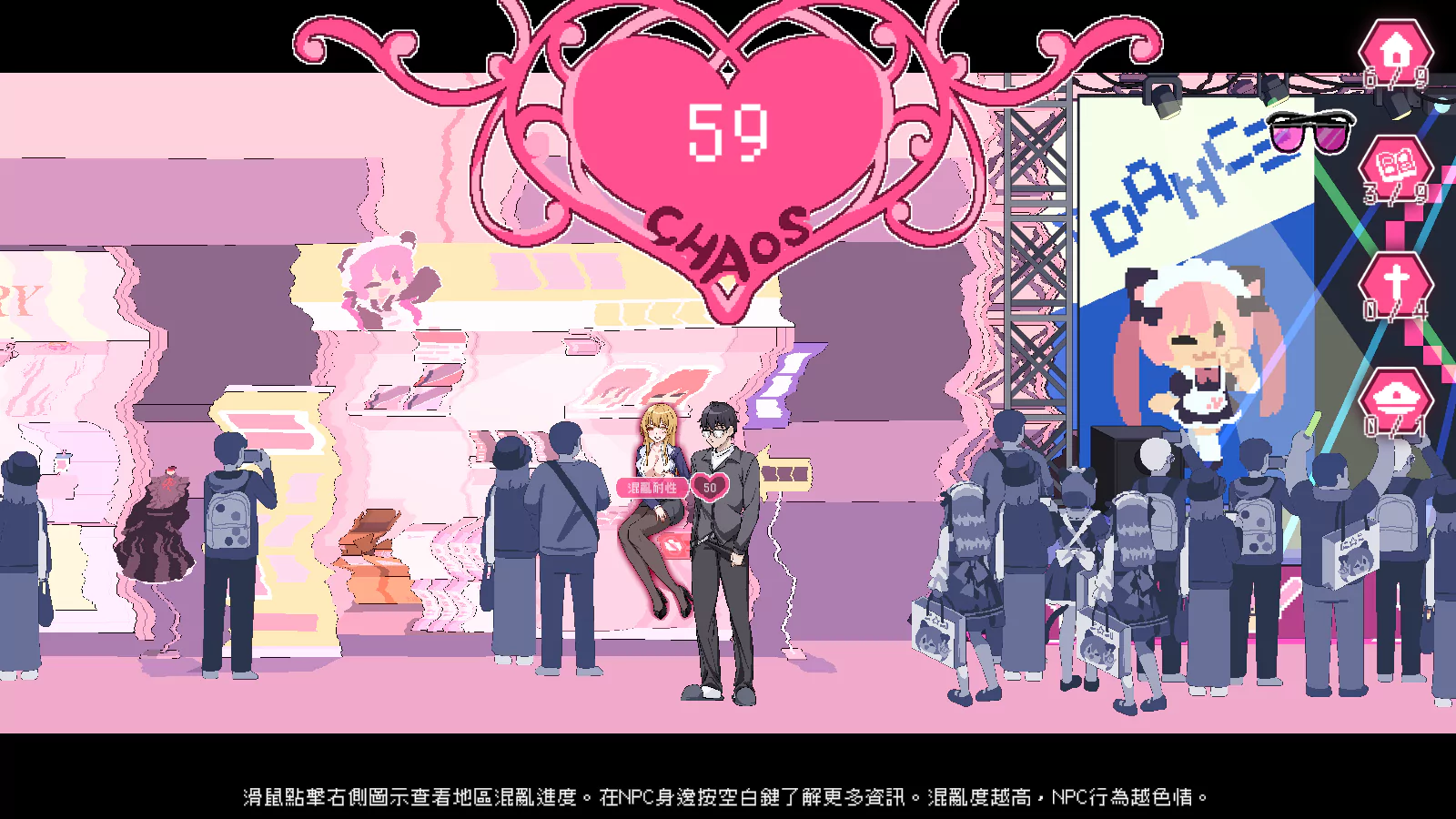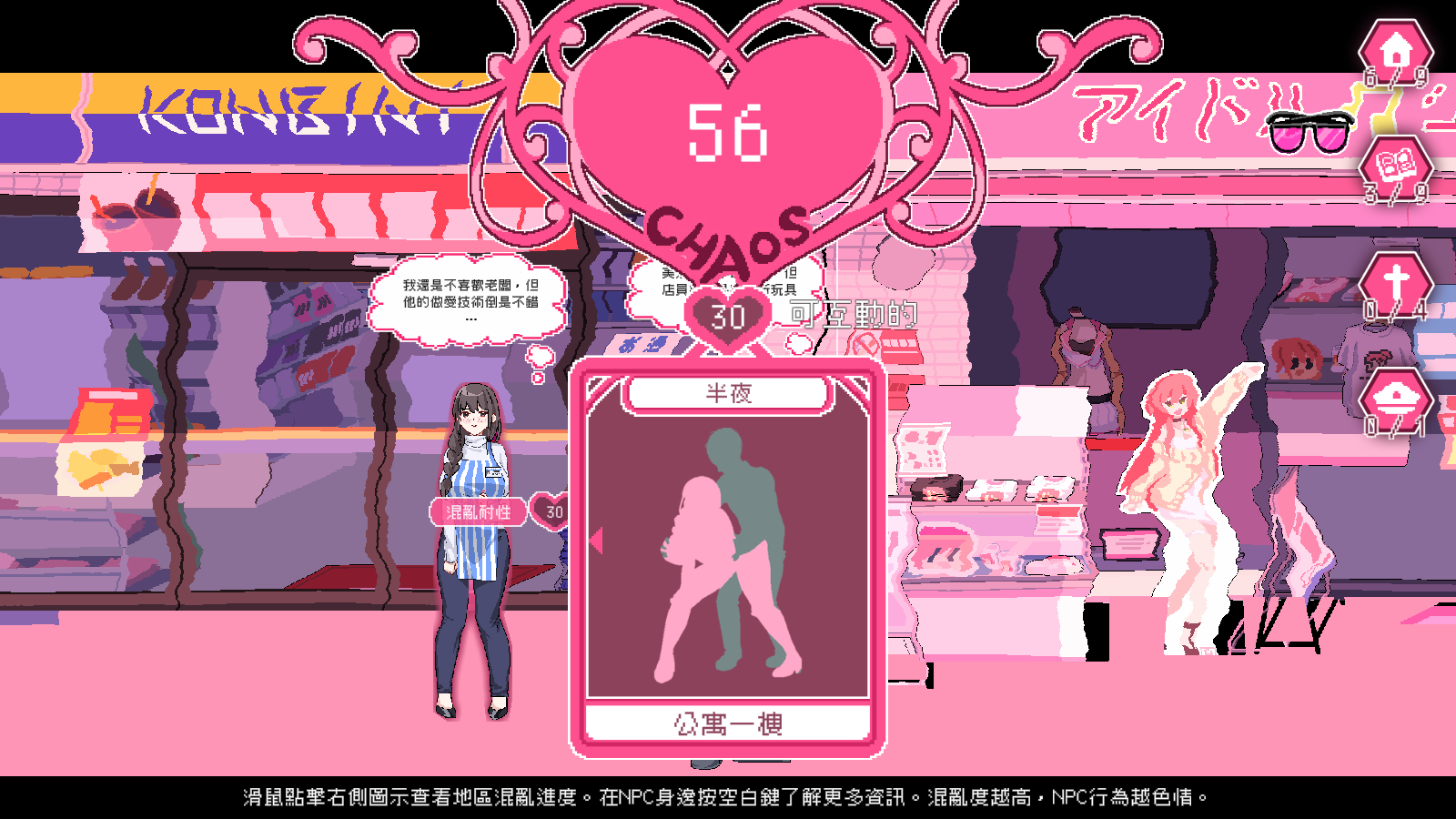 混亂度的主要功用還是在開啟配角的H事件,而其增減則有三個方式:工作、購物、告解,其中告解會在教堂場景開啟後才能使用。