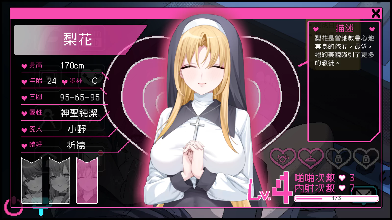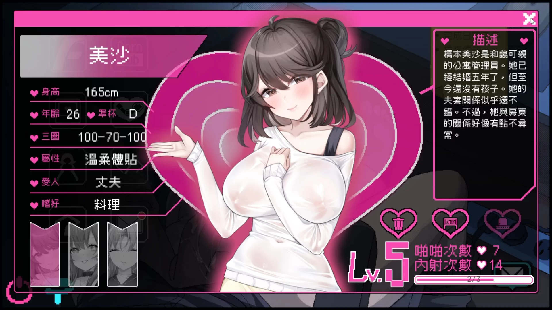 這裡有一點需要注意的部分,避免各位跟作者試玩的時候一樣做白工。 在攻略女主角的時候,系統會告知玩家進到下一階段的條件,有些是做愛次數達到條件,有時則是要玩過特定場景,這部分都可以在遊戲介面中查詢,只是因為沒有明確的用文字標註所以有誤會的可能性存在,請務必注意。