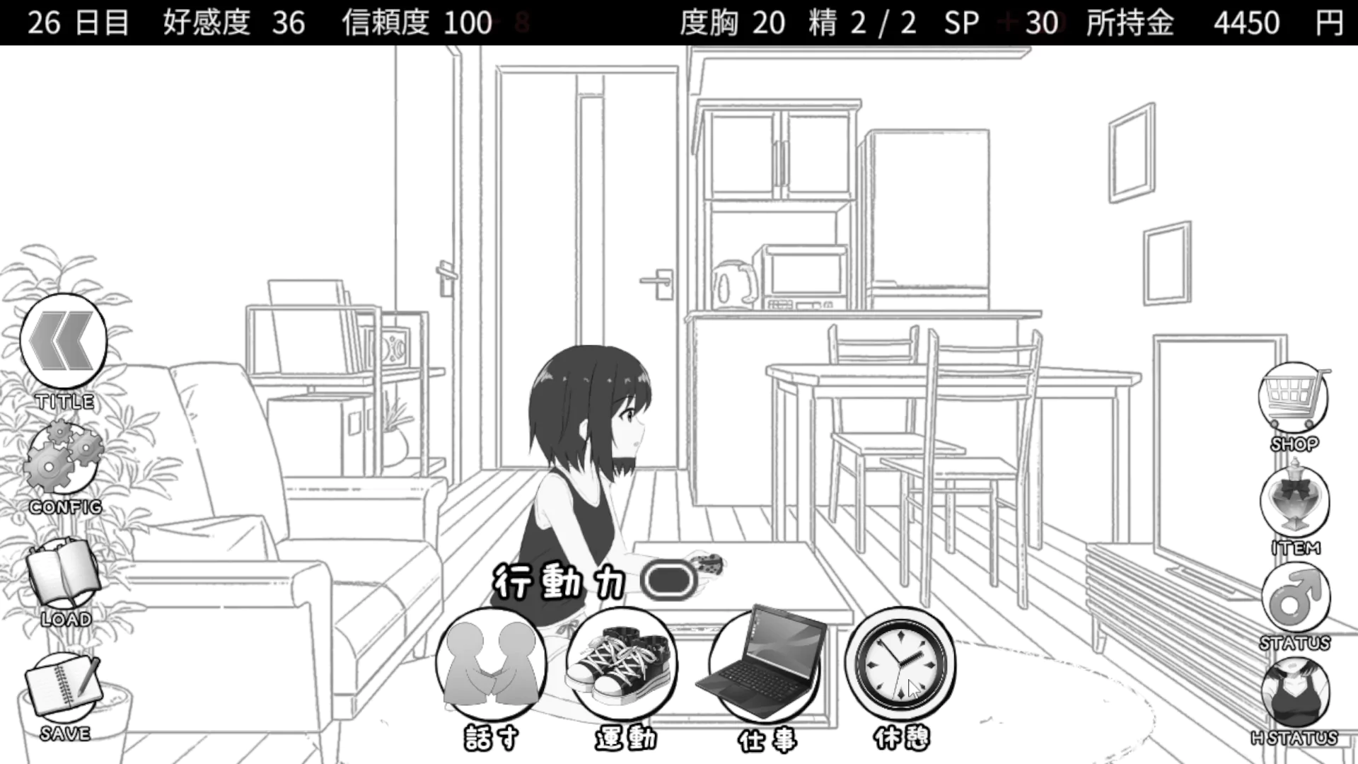 畫面右側從上到下分別是:商店、物品、狀態(男主角)、H狀態(女主角)