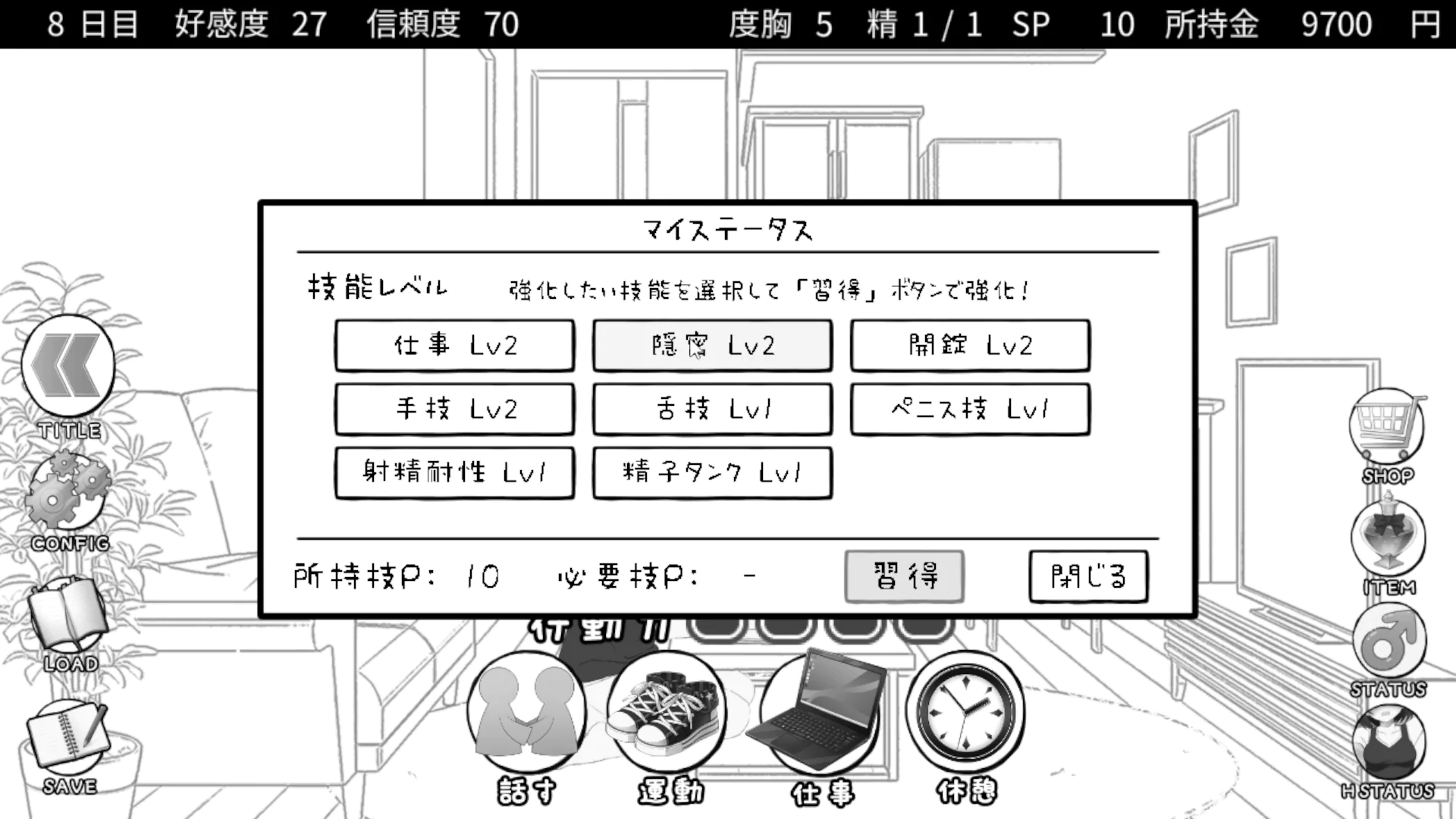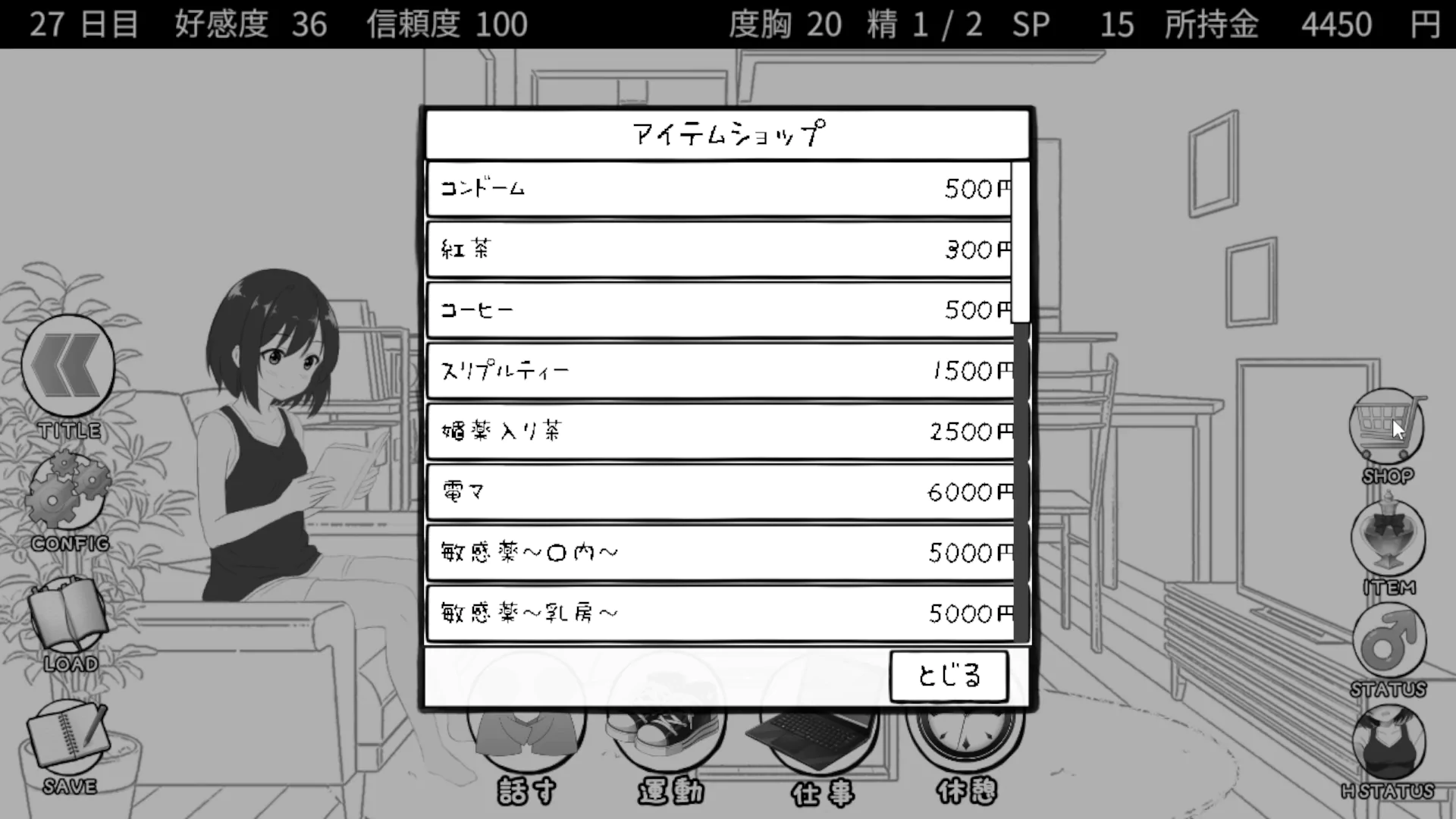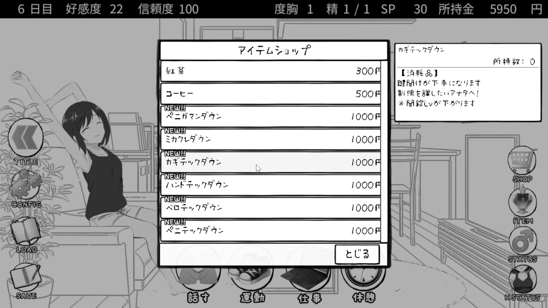 商品的部份除了「調理器具」和「ラブホテル予約」是必須購買的商品之外(一個是推進主線,一個是開啟CG),其他的都可買可不買,依玩家需求購入即可,有幾個「観察眼」是購入之後可以看到女主角特殊數值的道具,但因為不影響劇情,所以也沒有非買不可。