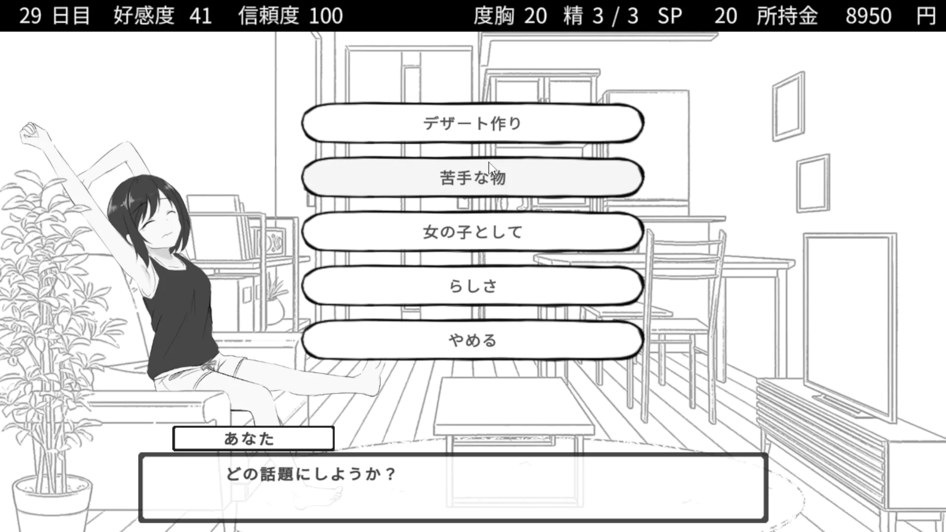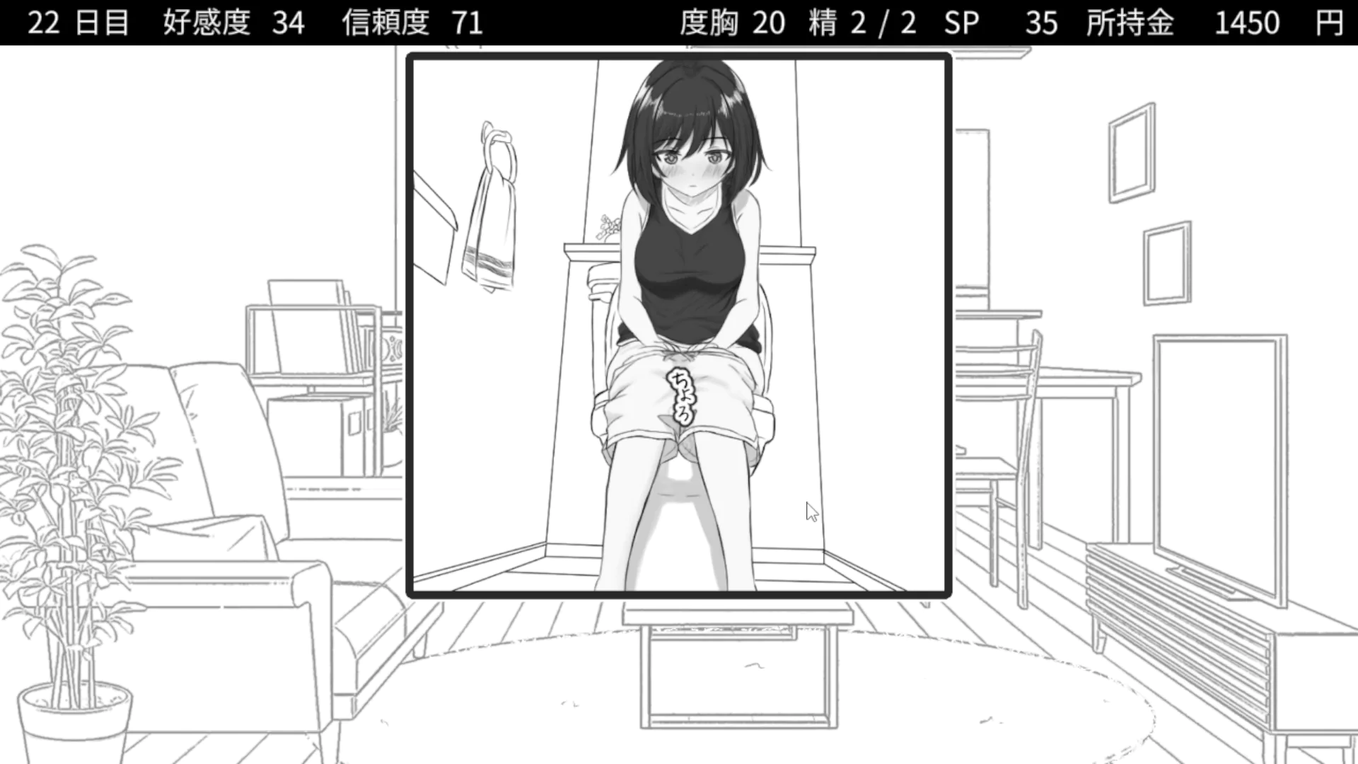 畫面正上方從左到右分別是:日期、好感度、信賴度、度胸、射精次數、SP、所持金