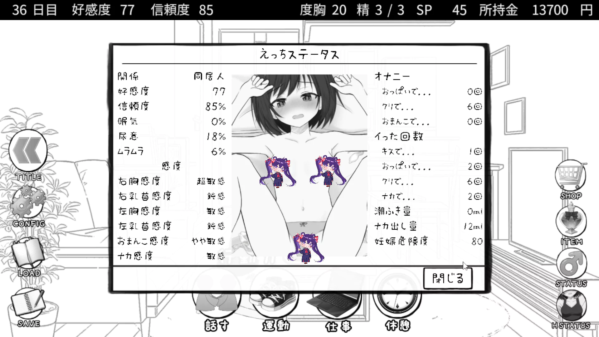 H狀態(女主角):確認女主角各項數值的地方,比較有用的應該是睡意、尿意跟性慾