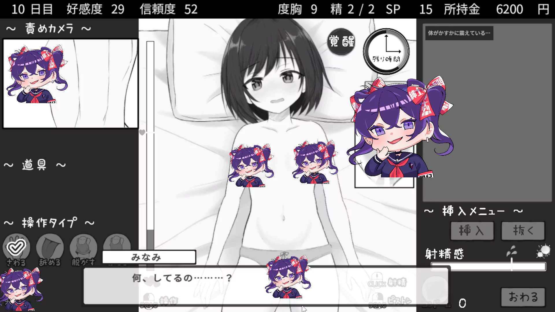 而女主角的狀態除了高潮值以外還有睡眠深度,從深到淺一共是「熟睡→睡眠→寢惚→覺醒」,在到一定進度之前只要女主角醒來夜襲都會直接結束,並扣除大量信賴值,請務必注意。