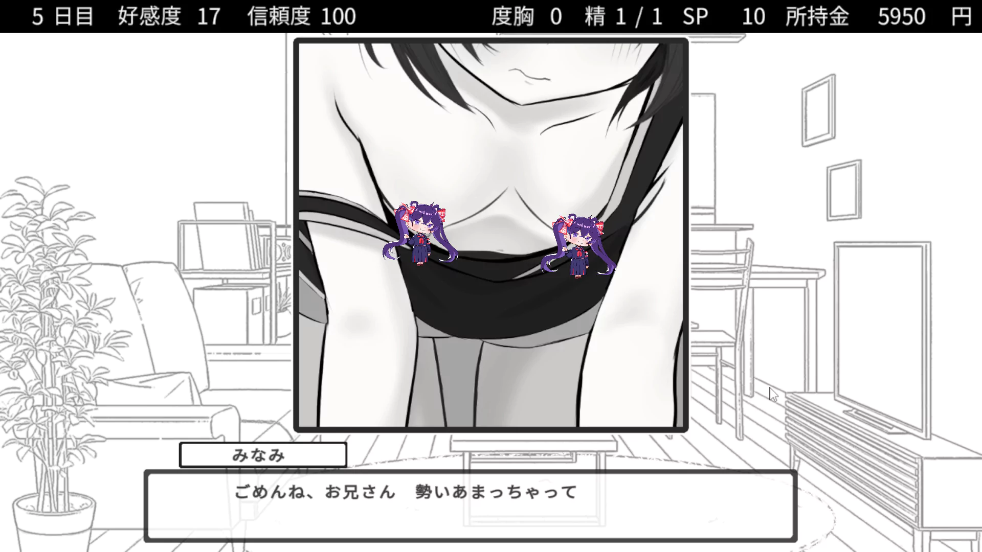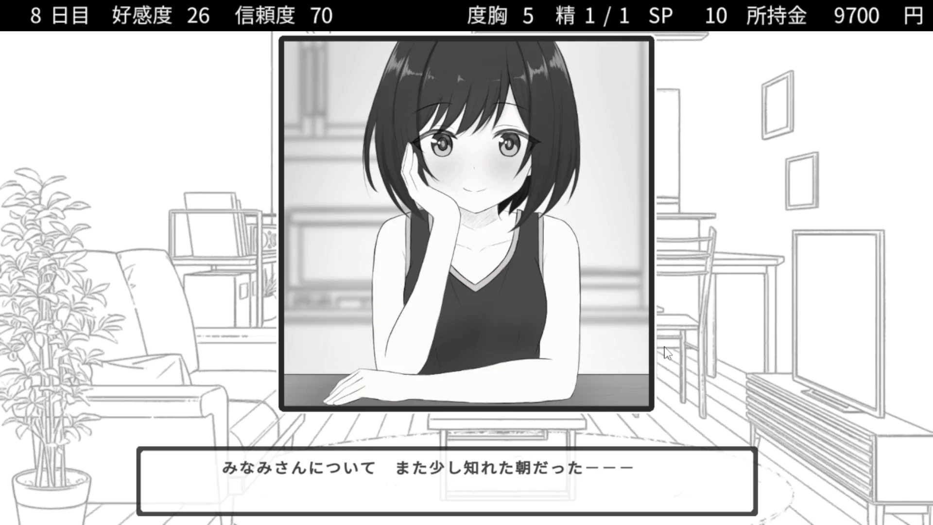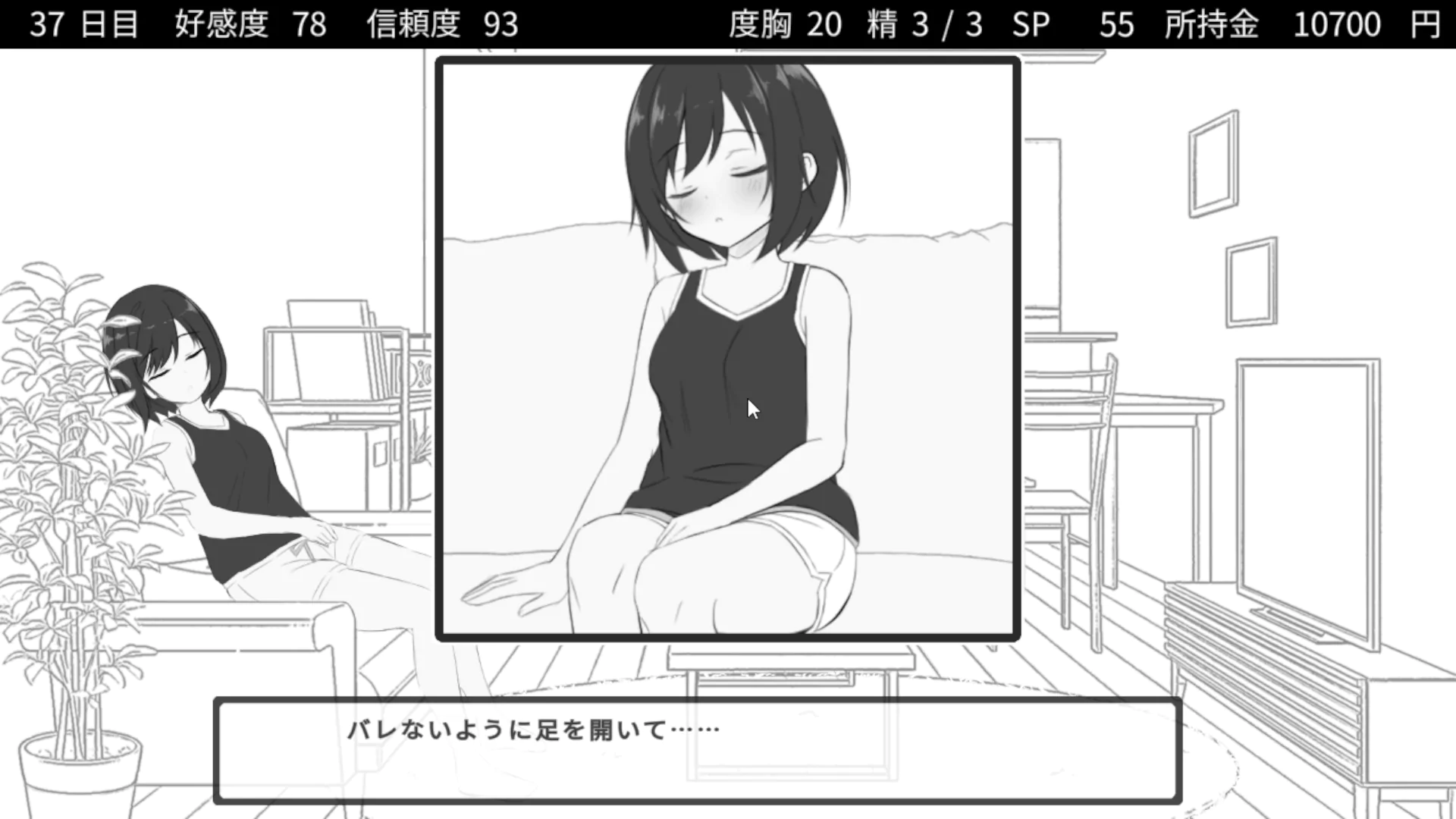 度胸:中文應該翻做膽量,可以說是本作最重要的數值,只要對女主角做出偷窺或夜襲等行為都可以提高度胸,而隨著度胸提高會解鎖更多道具跟玩法。