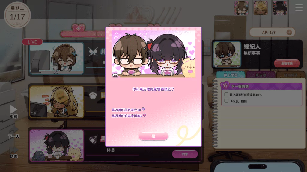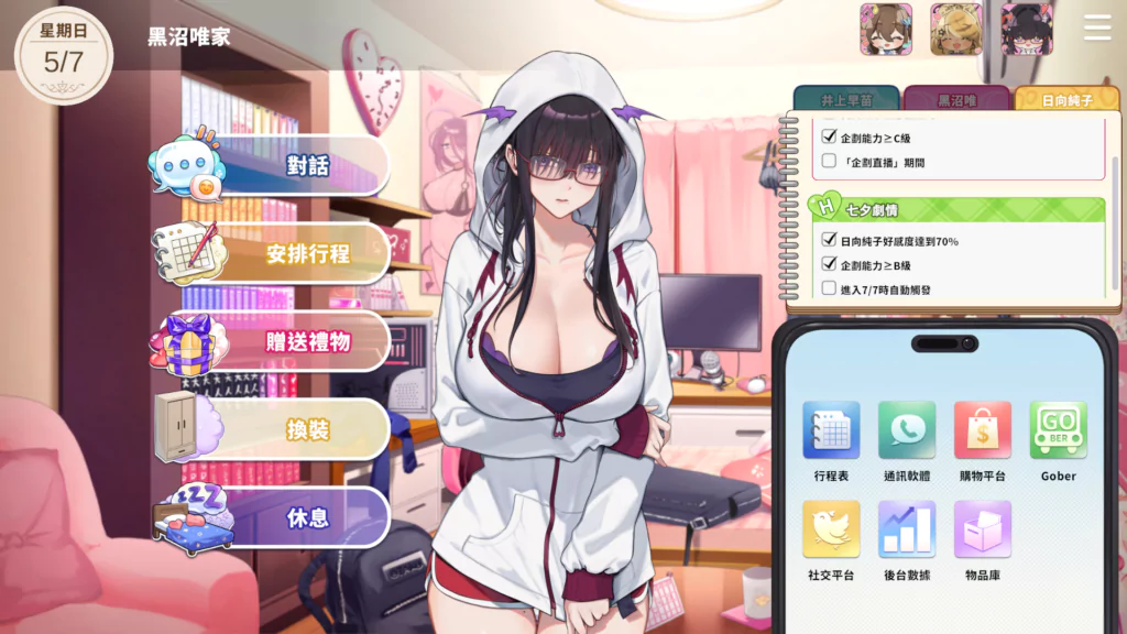 - 黑沼唯約你看影片:去可以提升好感度、在家睡覺可提升行動點數
